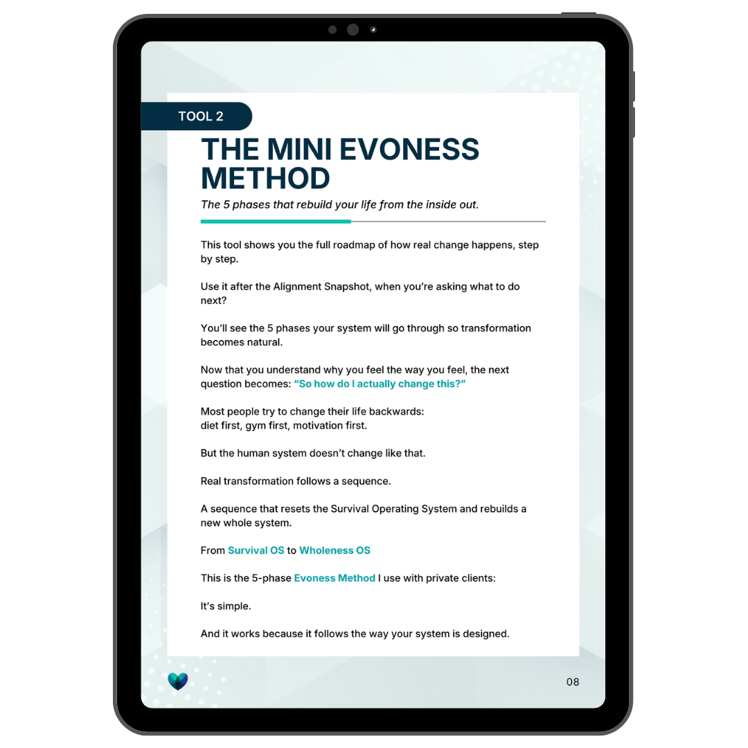 A simple breakdown of the 5-phase Evoness Method so you can see exactly how mindset, body, identity, and energy work together. No theory. No jargon. Just the structure.